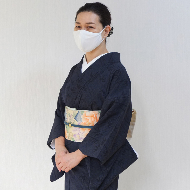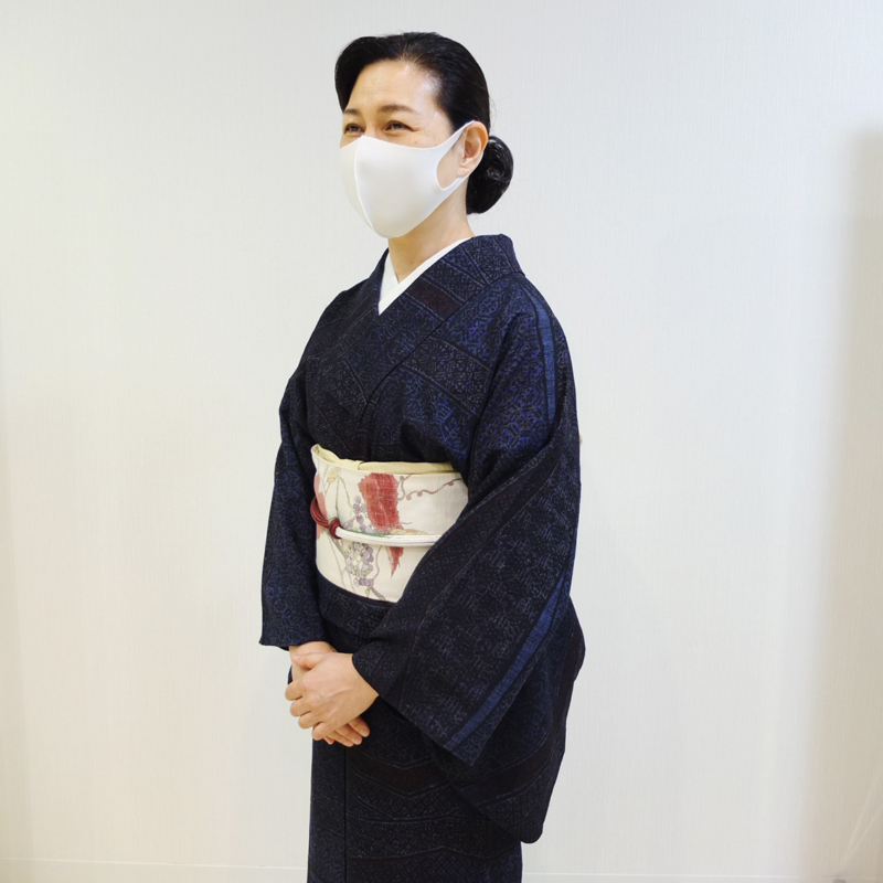 帯締めの鉄紺色がアクセントに