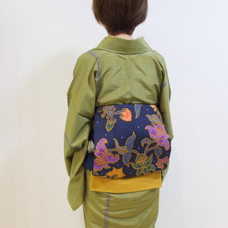 鮮やかな色彩が楽しい更紗模様の帯は