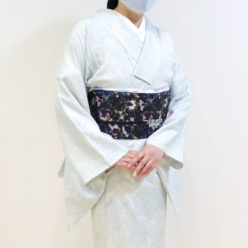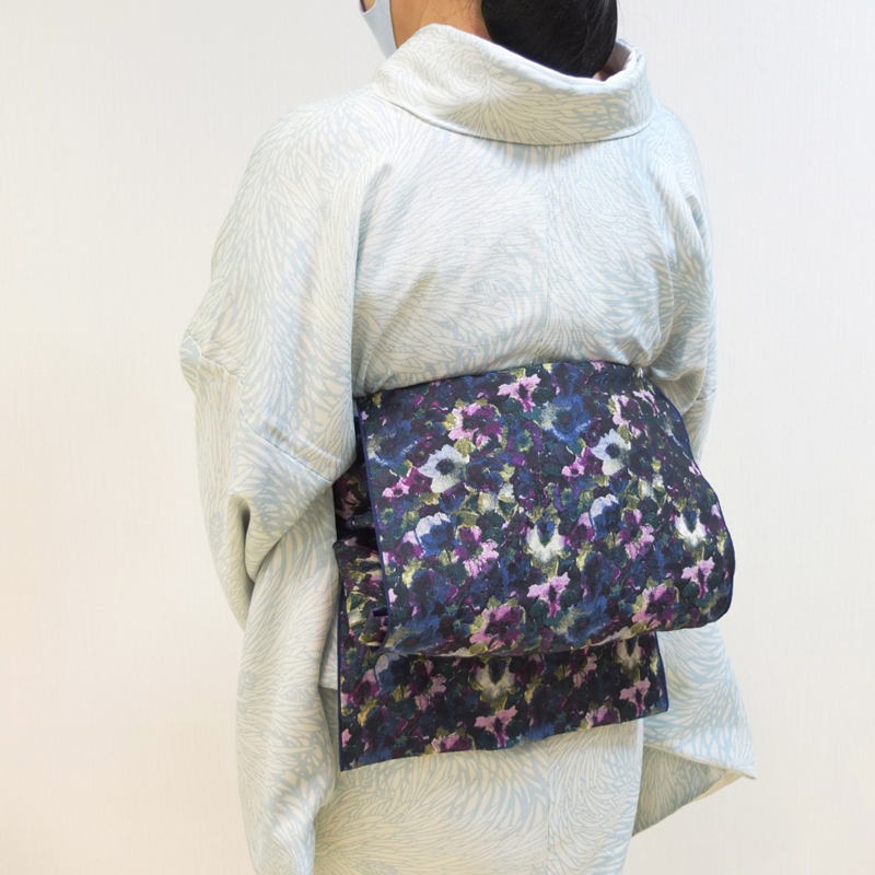 印象派の様な花柄の帯を角出しに結んで