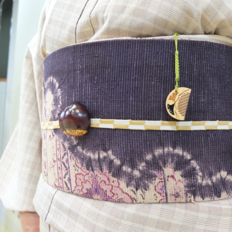 栗の帯留めと銀杏が描かれたつげ櫛の根付で