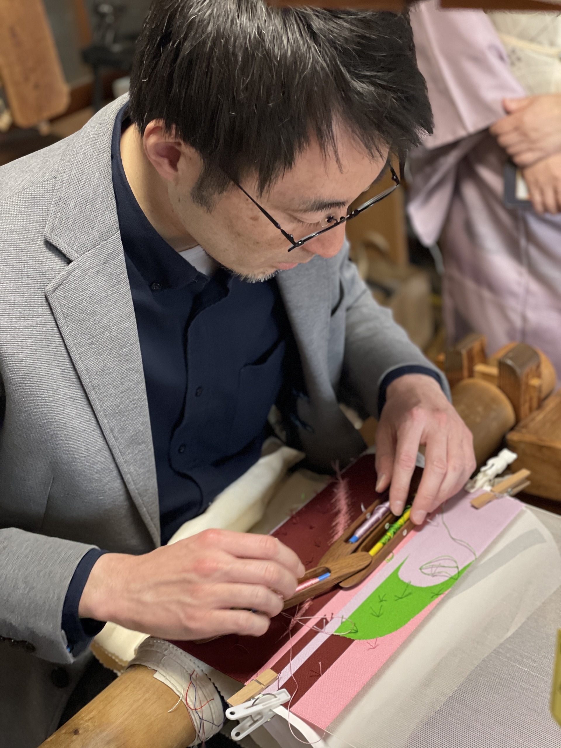 みやこメッセから工房へ戻ってくださっていた、服部紘樹さんが綴織の実演をしながら、柄を織り出していく過程を説明してくださいました。