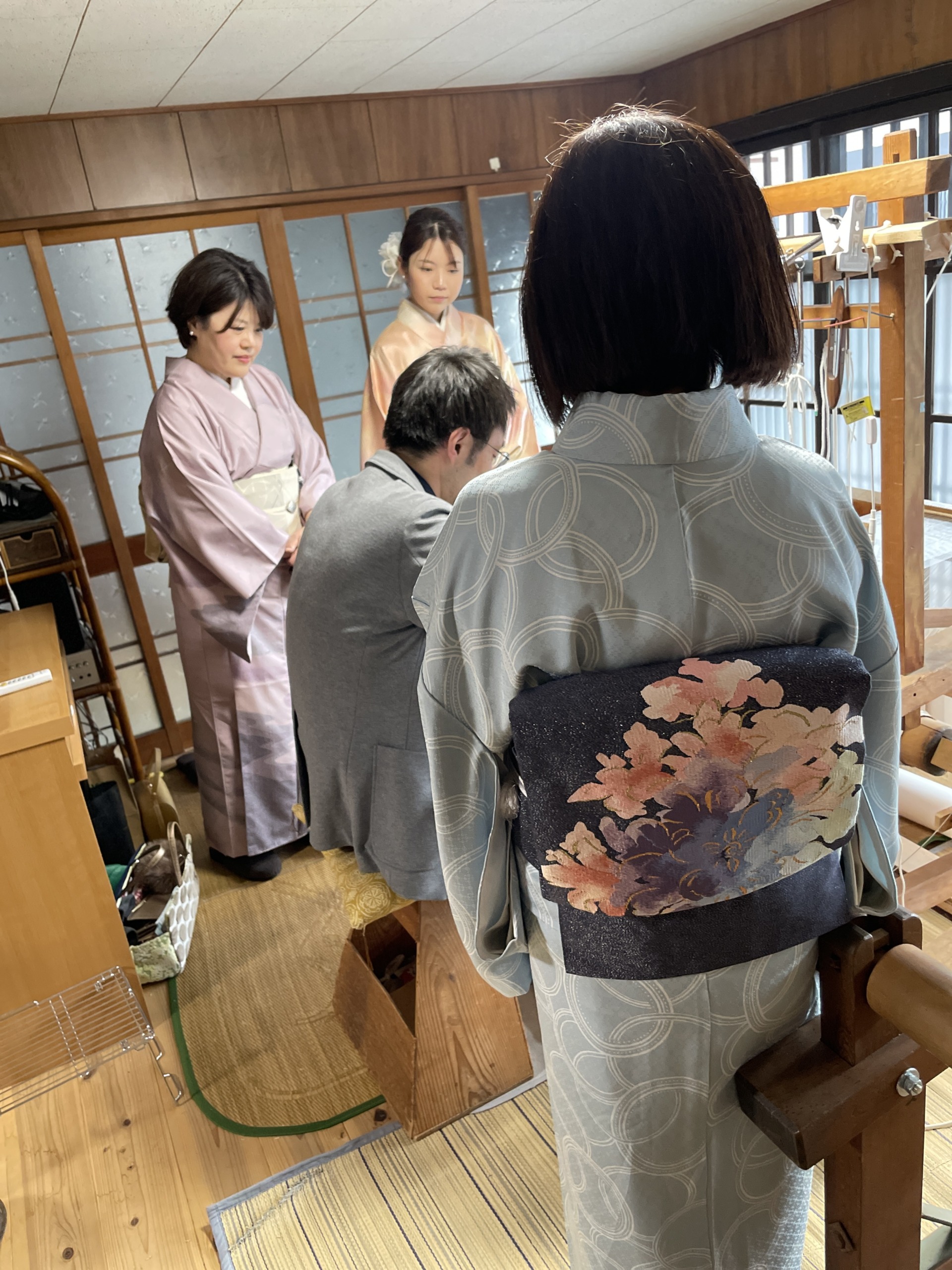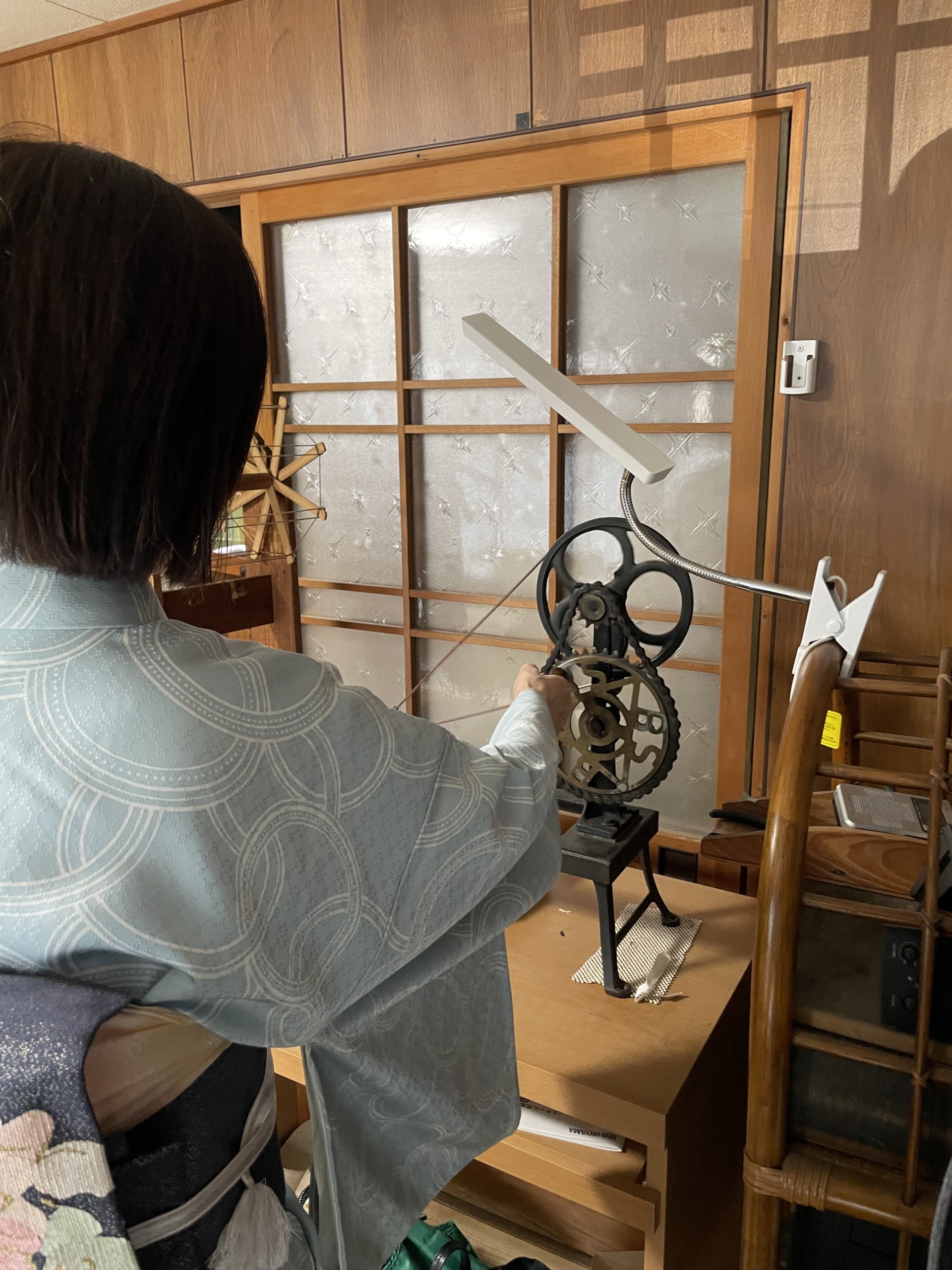 お洒落な糸車を回させてもらったり、綴織帯の特性などについても様々お話を伺って、服部さんの工房を後に。