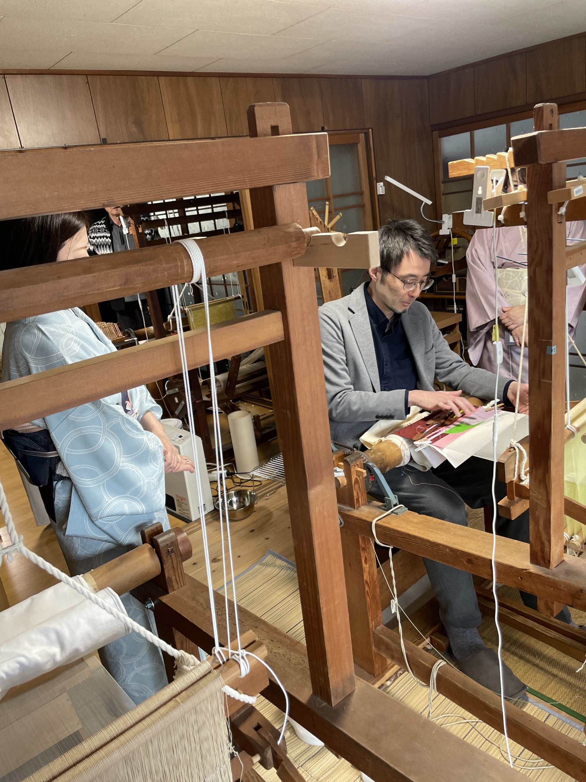 みやこメッセから工房へ戻ってくださっていた、服部紘樹さんが綴織の実演をしながら、柄を織り出していく過程を説明してくださいました。