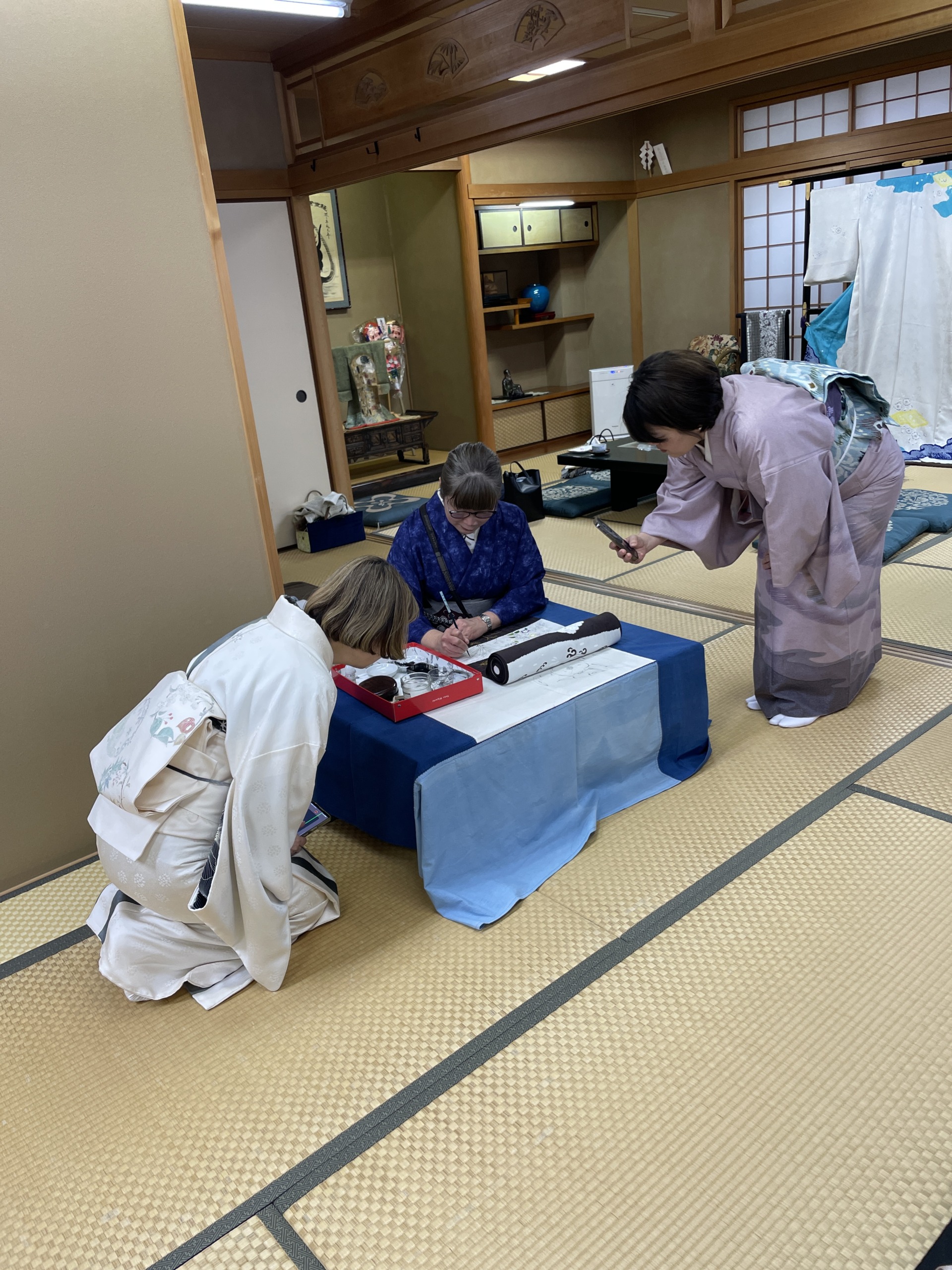 お二人とも質問などに応えられながら迷いなく手を動かされていく姿に「職人さんは本当に素晴らしい」と改めて感じるひとときとなり、その後に着物や帯を拝見させていただくと、より愛おしさが増します。