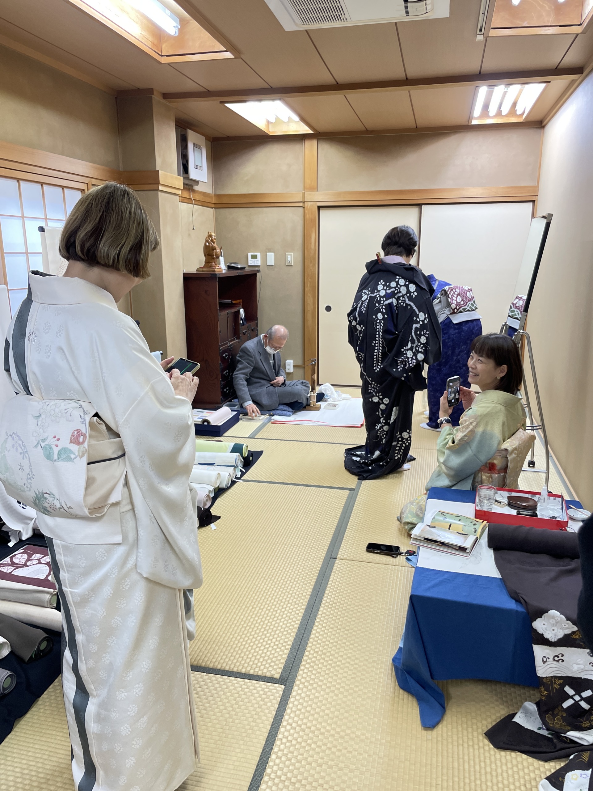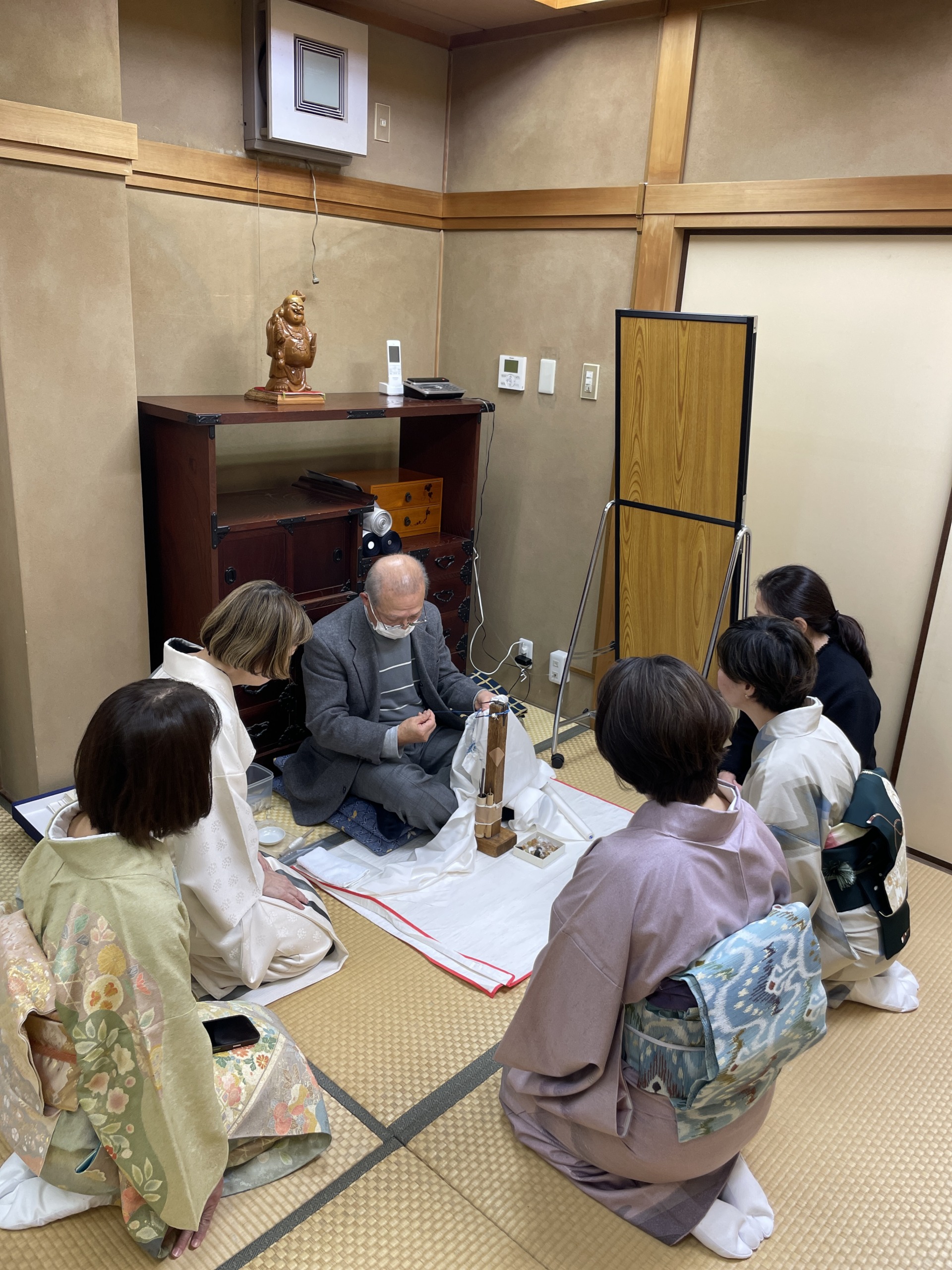 お二人とも質問などに応えられながら迷いなく手を動かされていく姿に「職人さんは本当に素晴らしい」と改めて感じるひとときとなり、その後に着物や帯を拝見させていただくと、より愛おしさが増します。
