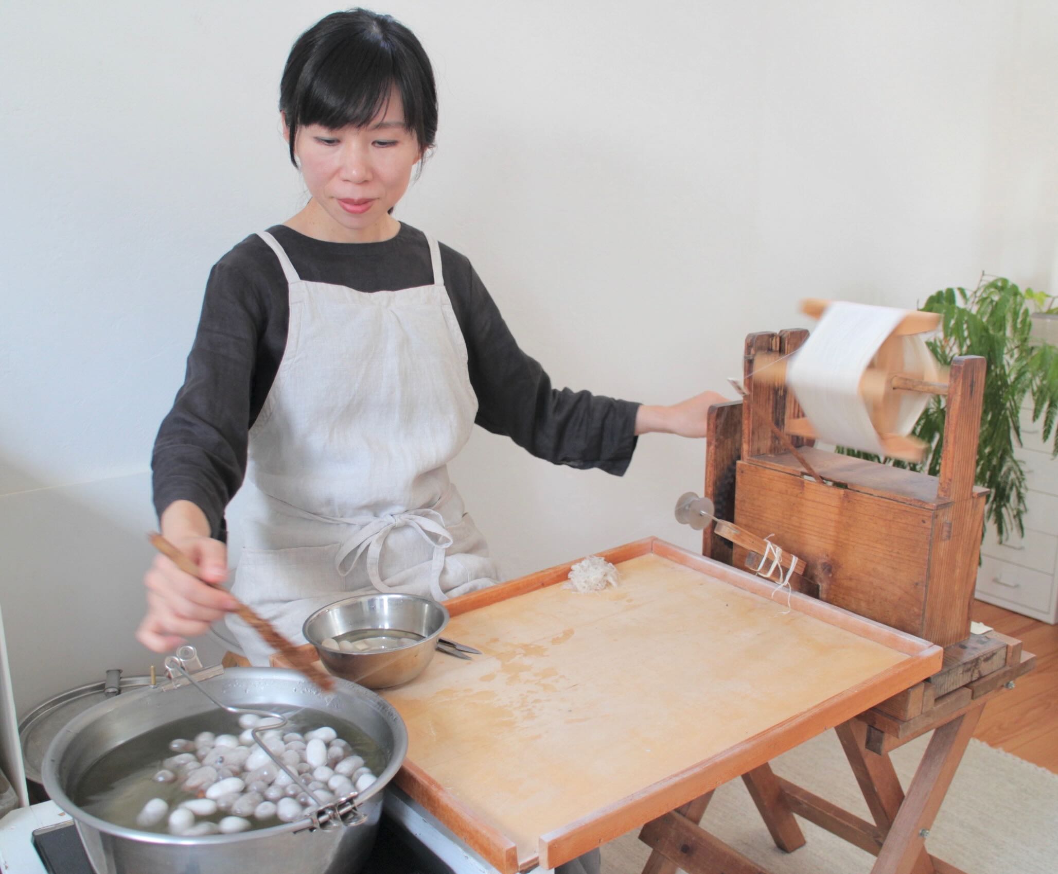 絹どころ群馬で受け継がれる伝統技術、上州座繰りによる糸作りだけでなく、その糸を用い草木染めを施して手織りの布を織り出しているcanoan・中野紘子さん。